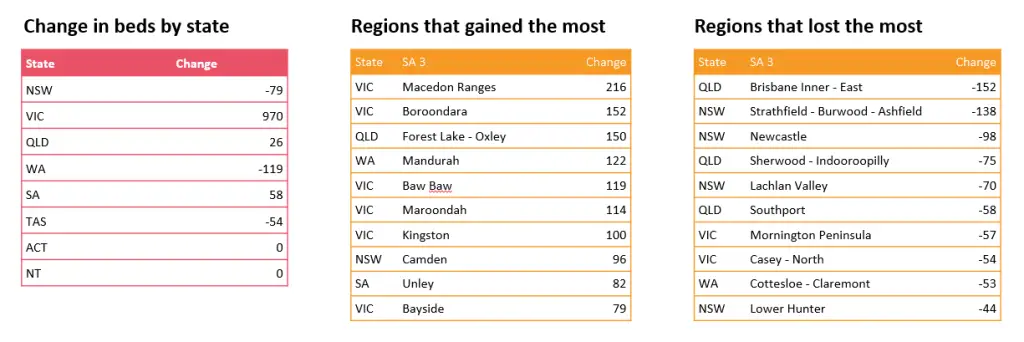 Bed supply also remains uneven across states. Victoria recorded the largest net gain of 970 new beds in 2024–25, while Western Australia saw the steepest decline, losing 119. New South Wales and Tasmania also reported net losses of 79 and 54 beds, respectively. Regionally, Brisbane’s inner east (152 beds) and Sydney’s Strathfield-Burwood-Ashfield area (138) were among the hardest hit.